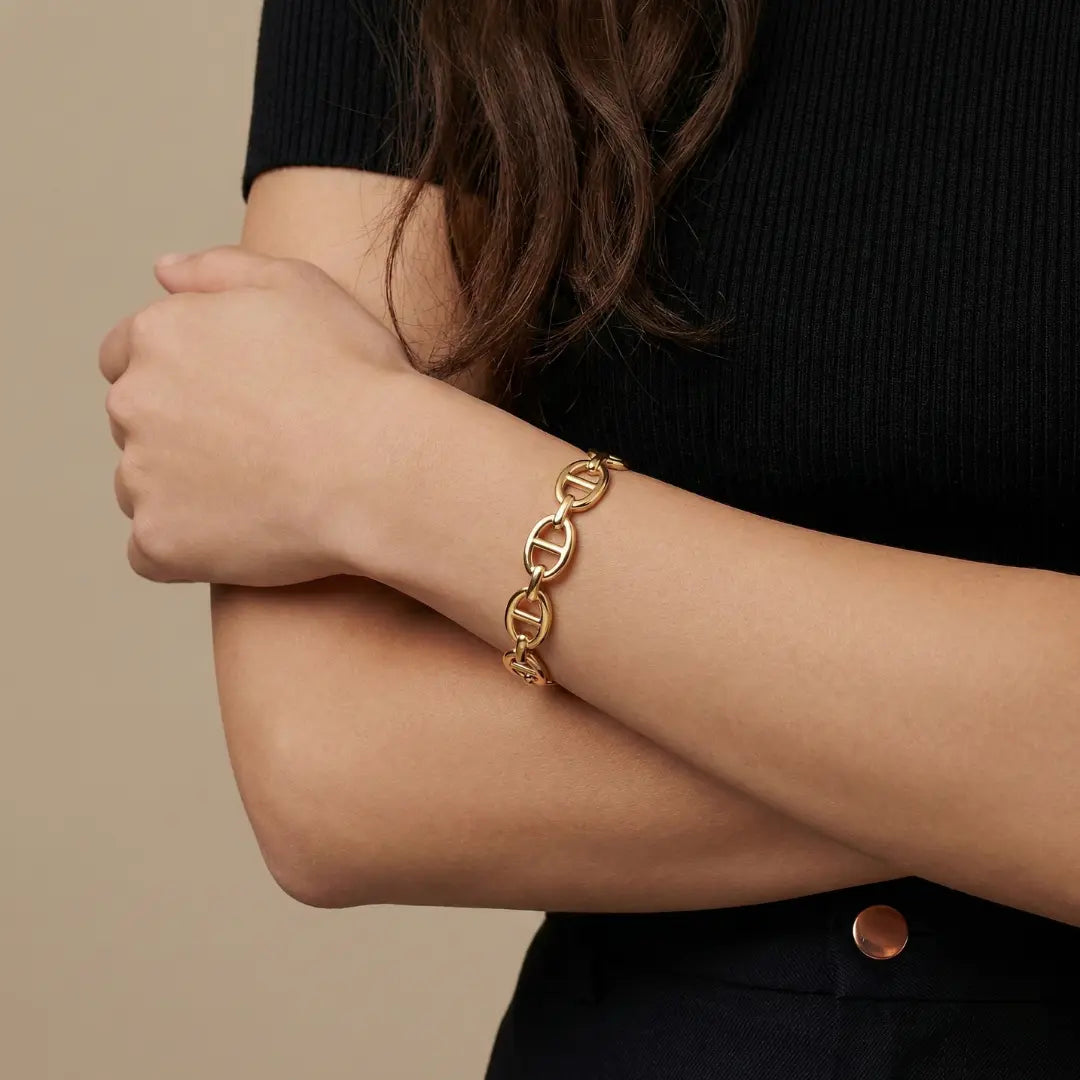 Épurés, ajustables et résistants à l’eau, nos joncs et bracelets en acier inoxydable doré se portent seuls ou en accumulation.